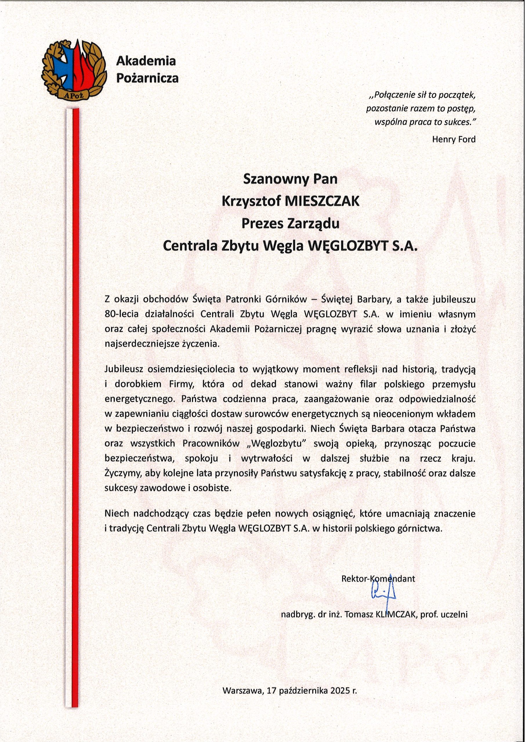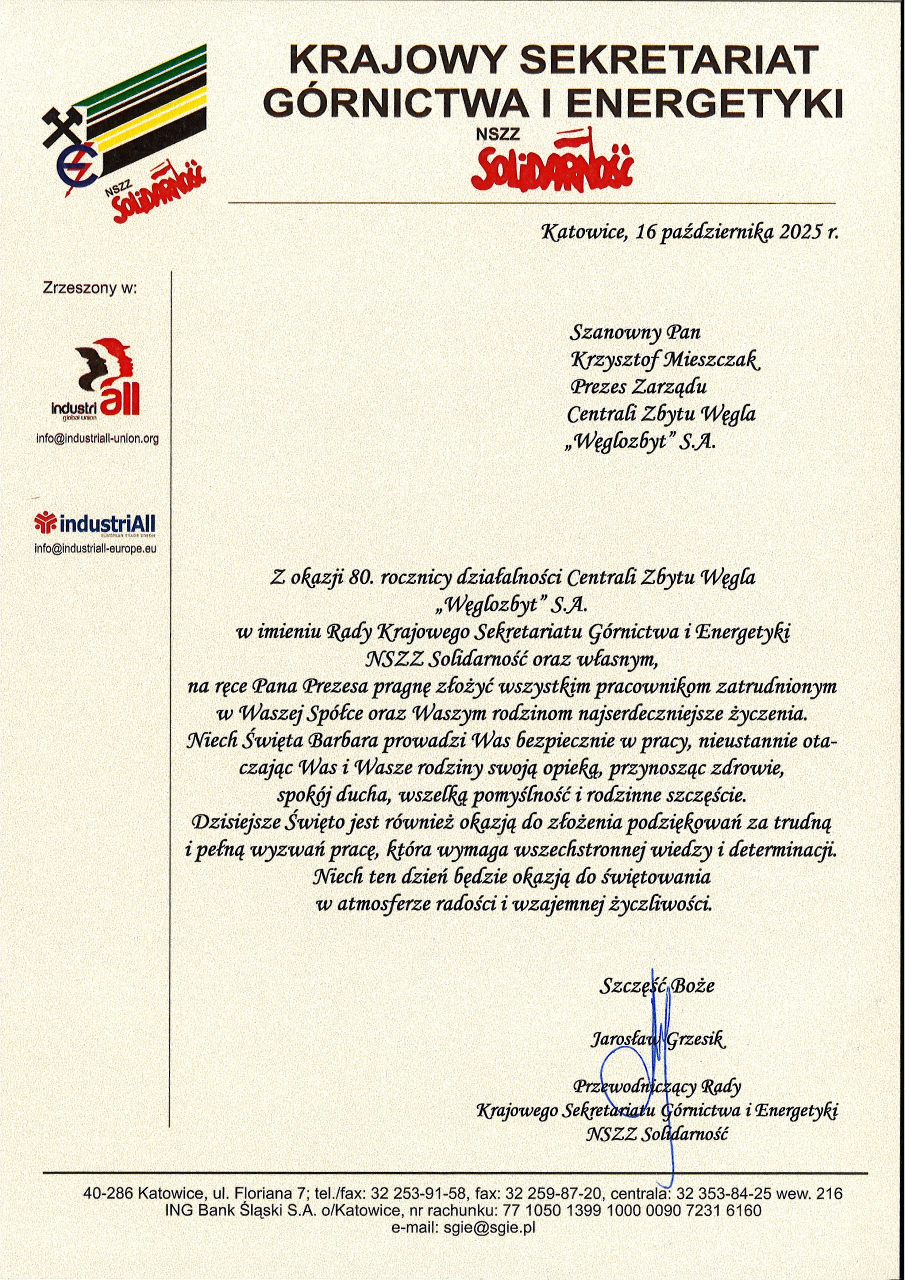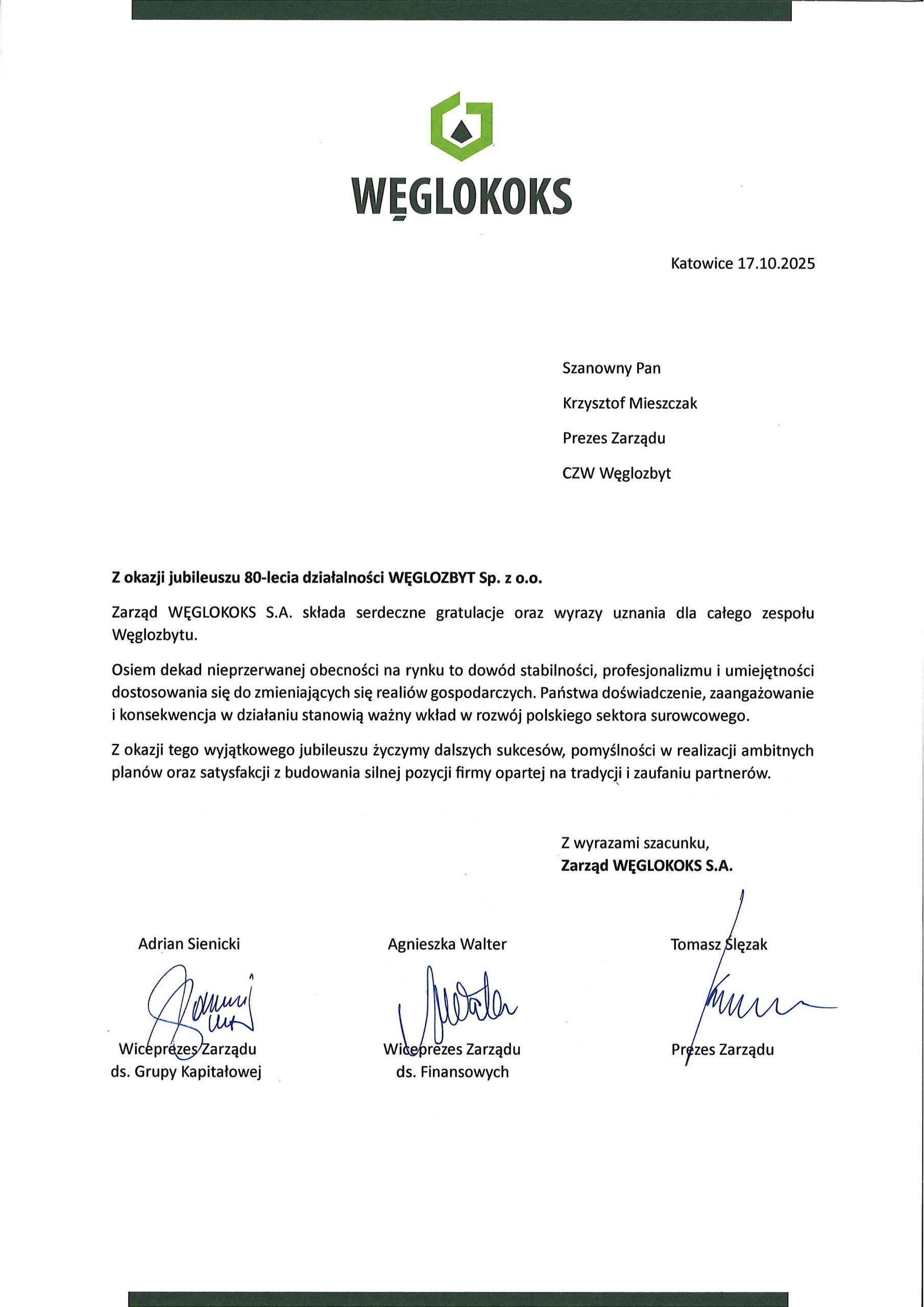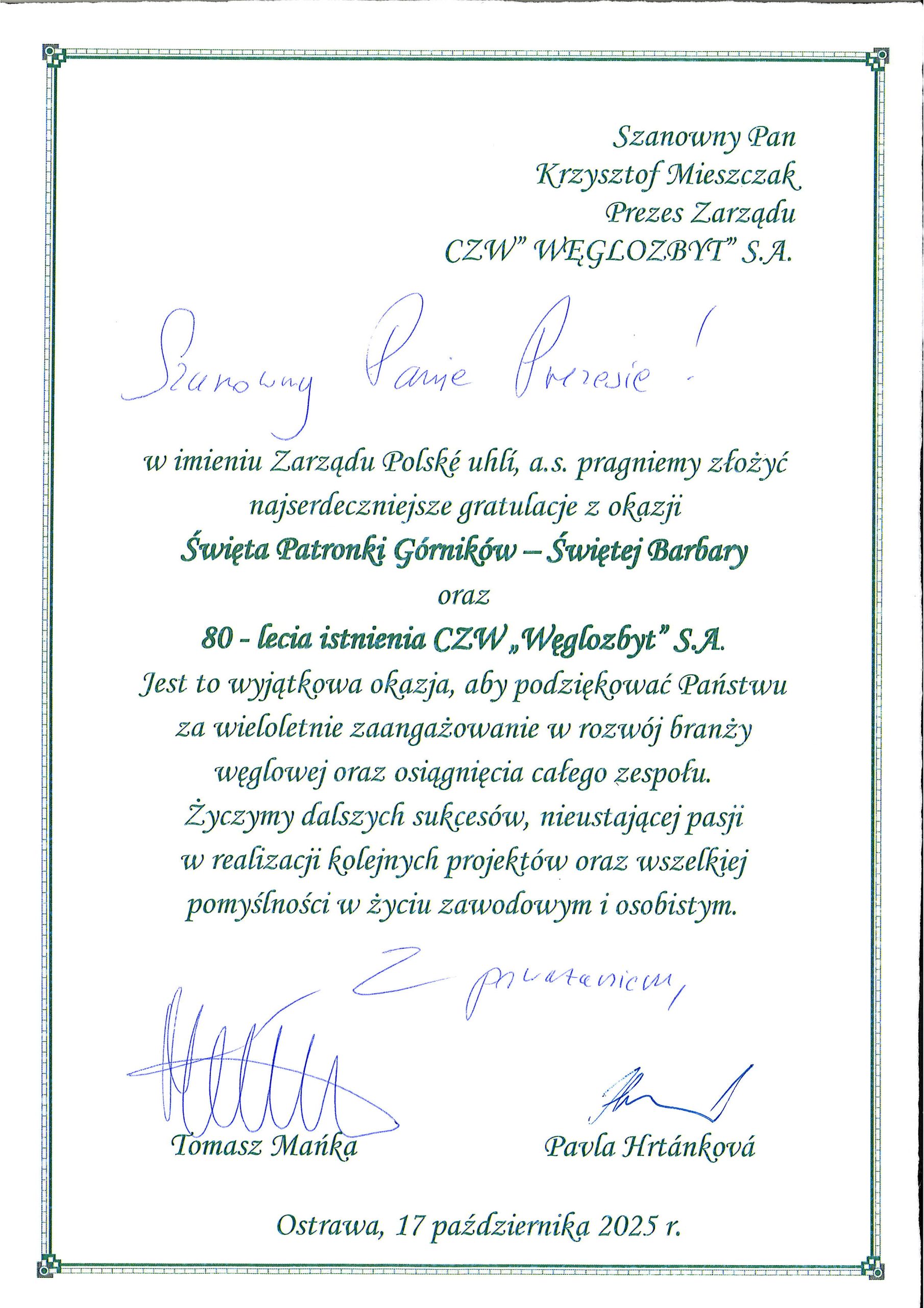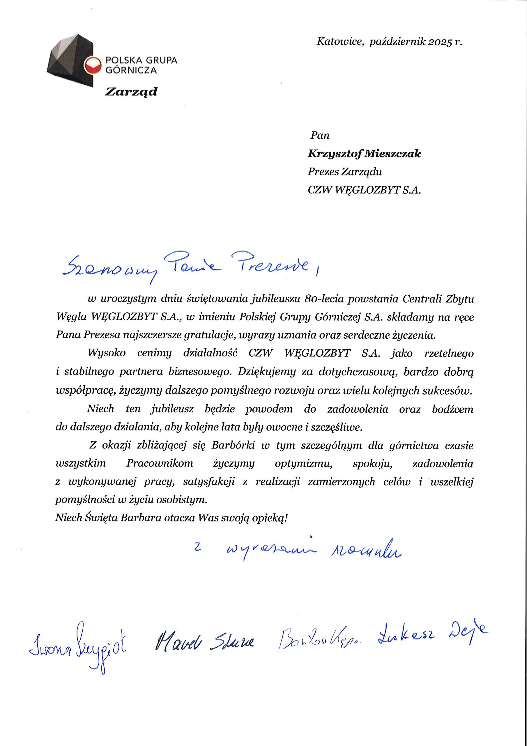 Tego szczególnego dnia otrzymaliśmy liczne listy gratulacyjne oraz życzenia, pełne serdeczności, uznania i słów wsparcia. Kierowano do nas życzenia dalszych sukcesów, stabilnego rozwoju oraz pomyślności zarówno w życiu zawodowym, jak i osobistym.