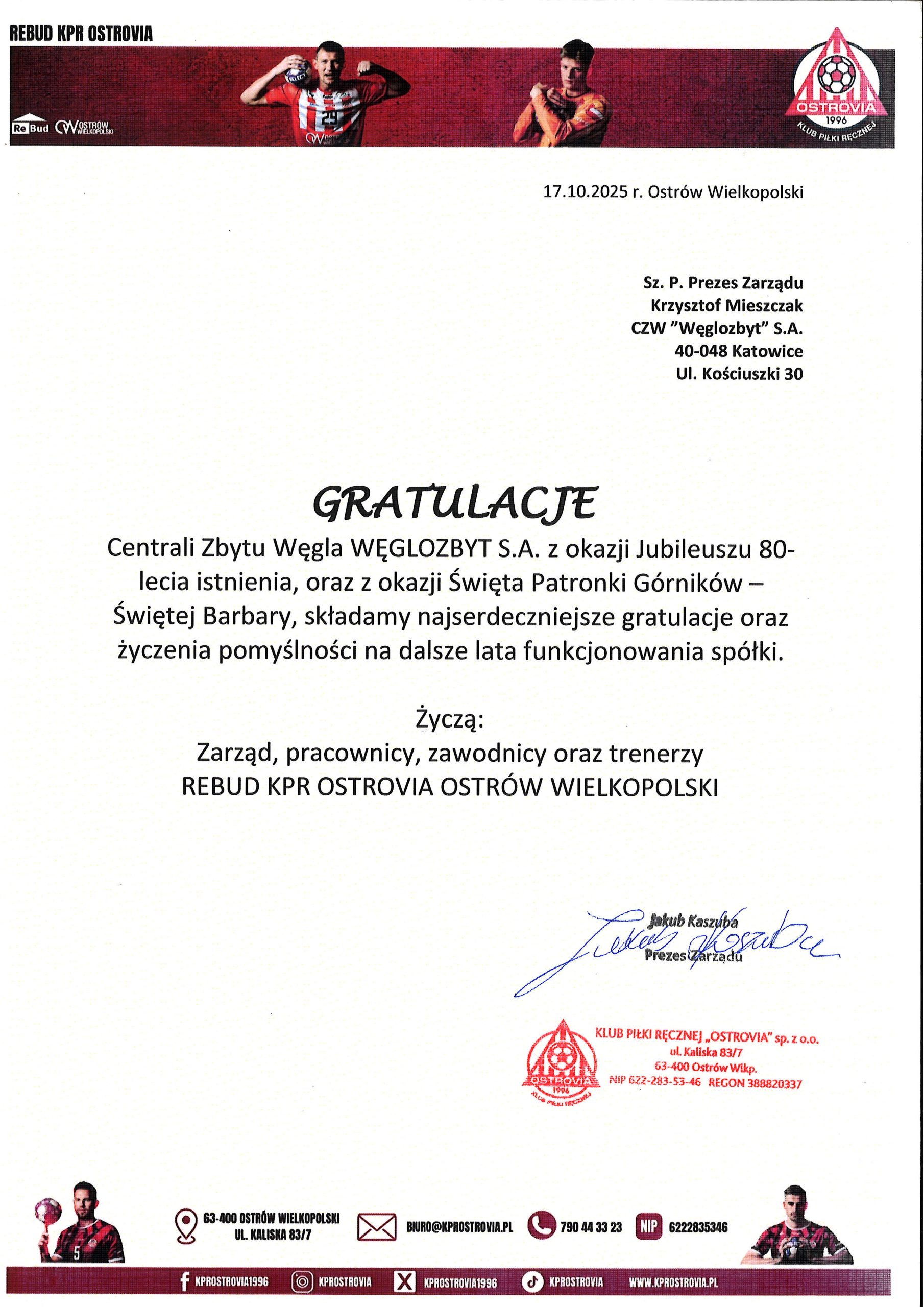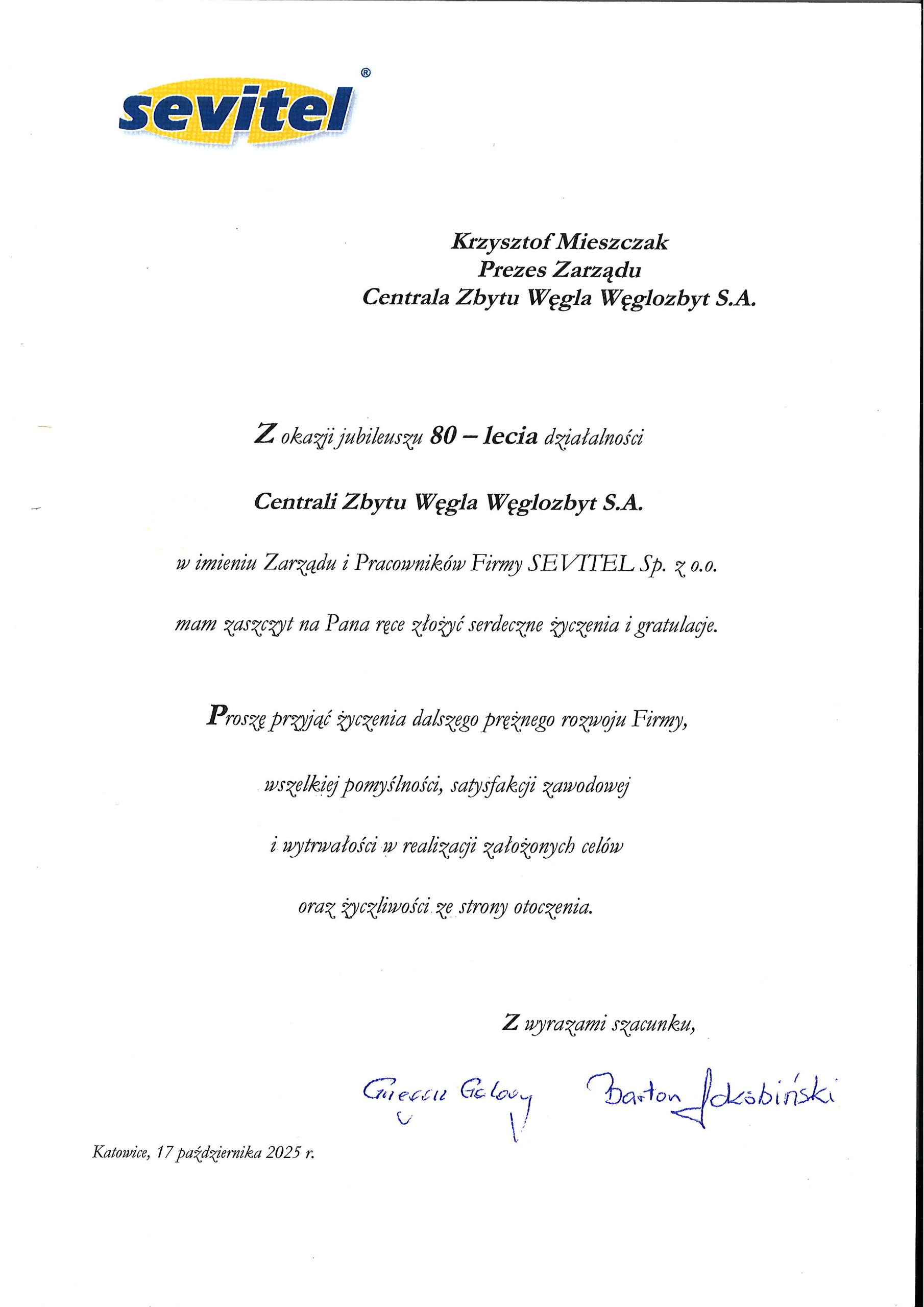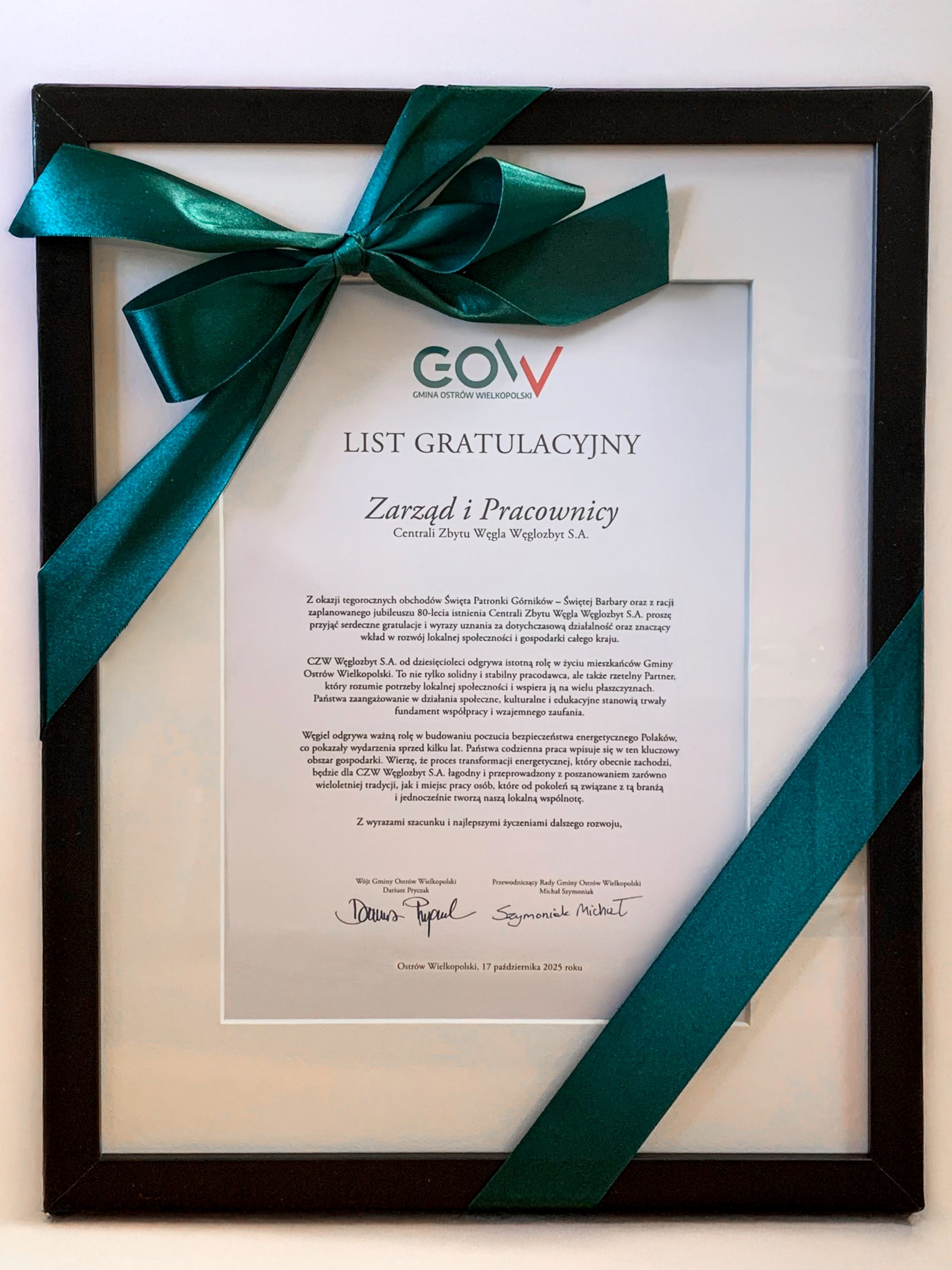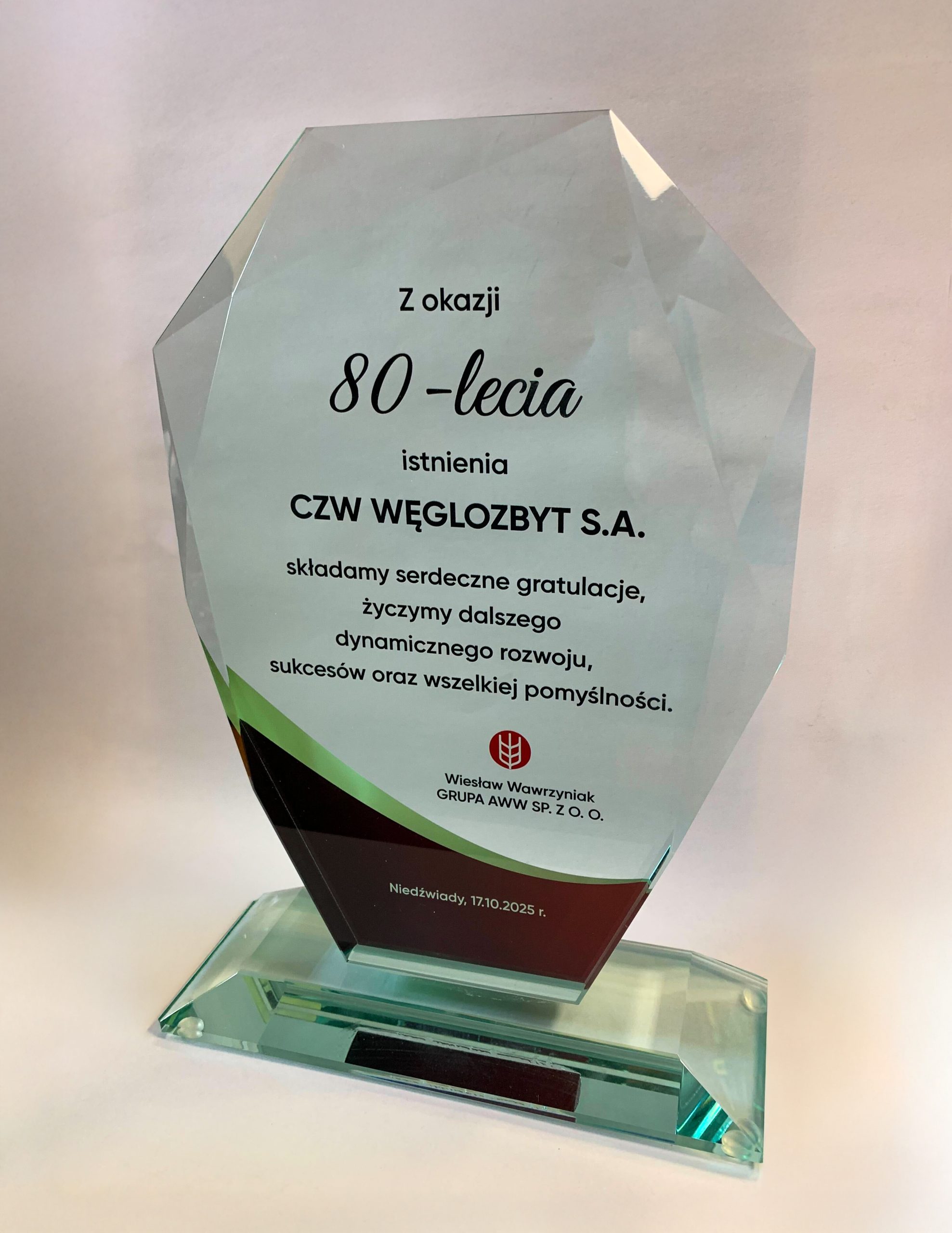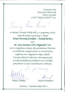 17 października 2025 roku w Ostrowie Wielkopolskim świętowaliśmy wyjątkowy jubileusz 80-lecia działalności CZW „Węglozbyt” S.A., połączony z tegorocznymi obchodami Barbórki. To ważne wydarzenie stało się okazją do wspólnego spotkania, podsumowania dotychczasowego dorobku oraz wyrażenia wdzięczności wobec wszystkich osób i instytucji, które współtworzyły historię Spółki.